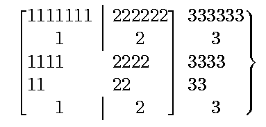 \begin{blockarray}{[c|c]c\}} 1111111 & 222222 & 333333 \\ 1 & 2 & 3 \\ \begin{block}{(ll)l\}} 1111 & 2222 & 3333 \\ 11 & 22 & 33 \\ \end{block} 1 & 2 & 3 \\ \end{blockarray} |