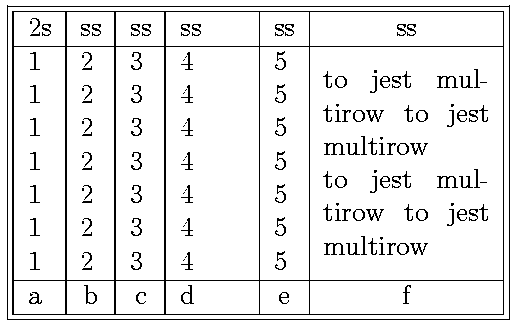 \begin{blockarray}{||l|c|c|t{1cm}|c|c||} \BAhhline{|t:======:t|} 2s & ss &ss &ss &ss&ss\\ \BAhhline{||------||} \begin{block}{||l|l|l|l|l|\BAmultirow{1in}||} 1 & 2 & 3 & 4 & 5 & \relax\\ 1 & 2 & 3 & 4 & 5 & to jest multirow to jest multirow to jest multirow to jest multirow to jest multirow \\ 1 & 2 & 3 & 4 & 5 & \relax\\ 1 & 2 & 3 & 4 & 5 & \relax\\ 1 & 2 & 3 & 4 & 5 & to jest multirow to jest multirow \\ 1 & 2 & 3 & 4 & 5 & \relax\\ 1 & 2 & 3 & 4 & 5 & \relax\\ \end{block} \BAhhline{||------||} a & b & c & d & e & f\\ \BAhhline{|b:======:b|} \end{blockarray} |